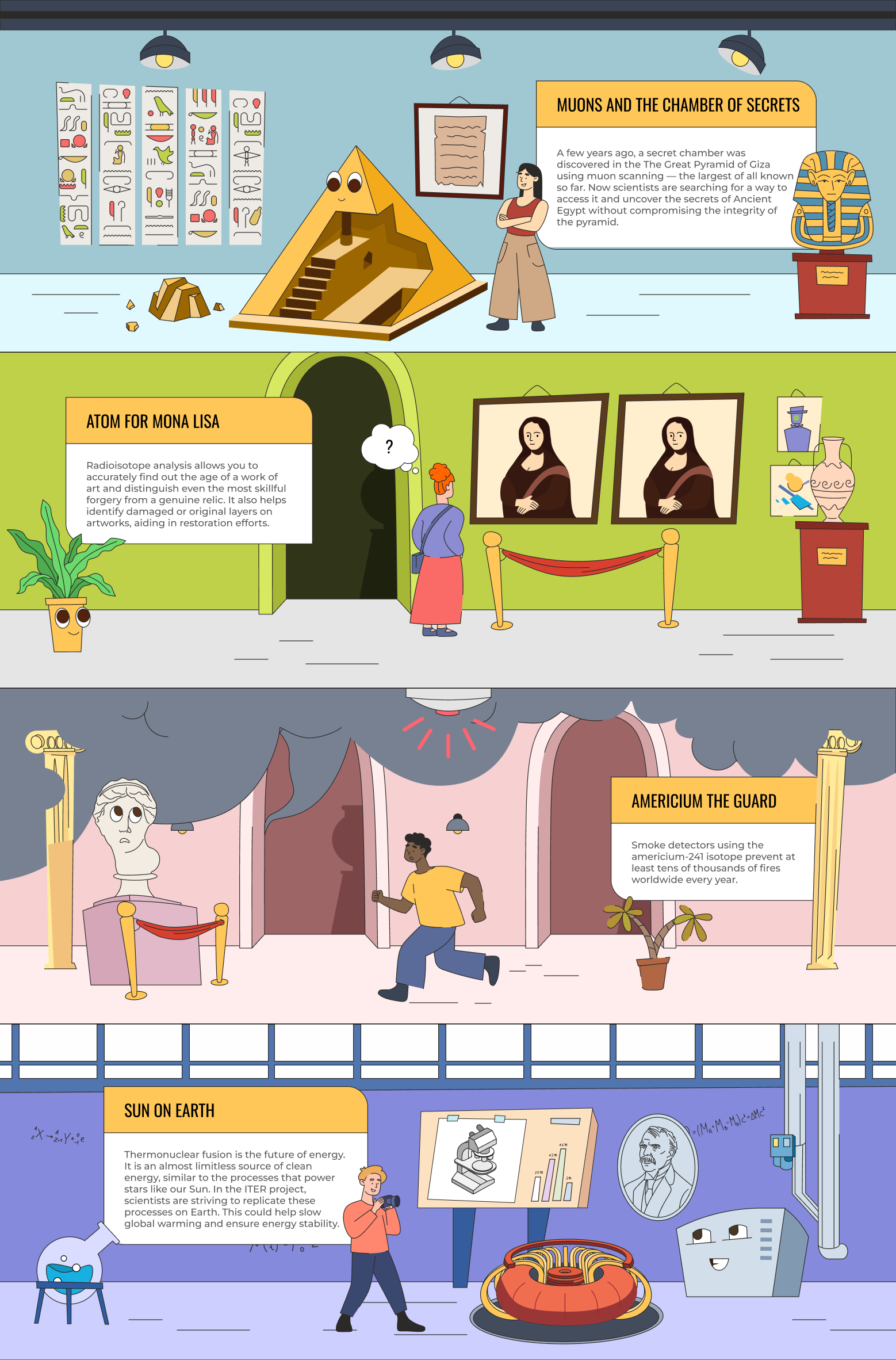 Ahead, you will find 25 unique questions along with intriguing answers: 5 questions per each of the 5 areas of the brightest nuclear achievements. Don’t forget to keep an eye on the time! Your overall performance will depend on both – your score and speed – how correct and fast you respond to each question.